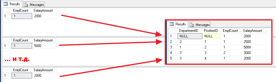 - с предложением GROUP BY, которое в скупе с агрегатными функциями позволяет получить итоги по детальным данным в разрезе групп;